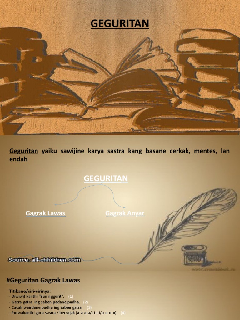 More images for geguritan gagrak lawas yaiku » Cacahe gatra utawa larik ora ajeg, nanging paling sithik 4 gatra utawa 4 larik; Bebas jumlah larik larik ukara ing saben pada, jumlahe pada, pilihan basa kang digunakake, maksude panggurit ana kang nggunakake purwakanthi kadhang ora migunakake purwakhanti. Panjang dan pendeknya isi dalam geguritan pasti memiliki tema. Sep 04, 2016 · geguritan yaiku puisi jawa gagrag anyar kang ora kaiket dening paugerahan tertamtu.